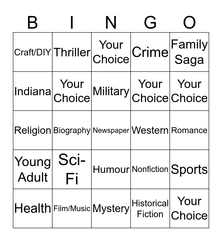 This bingo card has a free space and 24 words: Sci-Fi, Film/Music, Military, Health, Family Saga, Craft/DIY, Indiana, Thriller, Western, Humour, Your Choice, Religion, Nonfiction, Sports, Your Choice, Historical Fiction, Romance, Your Choice, Your Choice, Biography, Your Choice, Young Adult, Crime and Mystery.