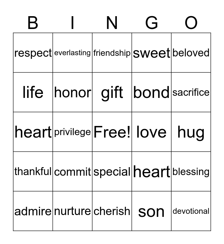 This bingo card has a free space and 29 words: mother, nurture, friendship, thankful, beloved, respect, honor, gift, love, blessing, admire, privilege, son, devotional, heart, enduring, cherish, heart, sacrifice, thankful, commit, lifetime, bond, hug, life, everlasting, special, sweet and friend.