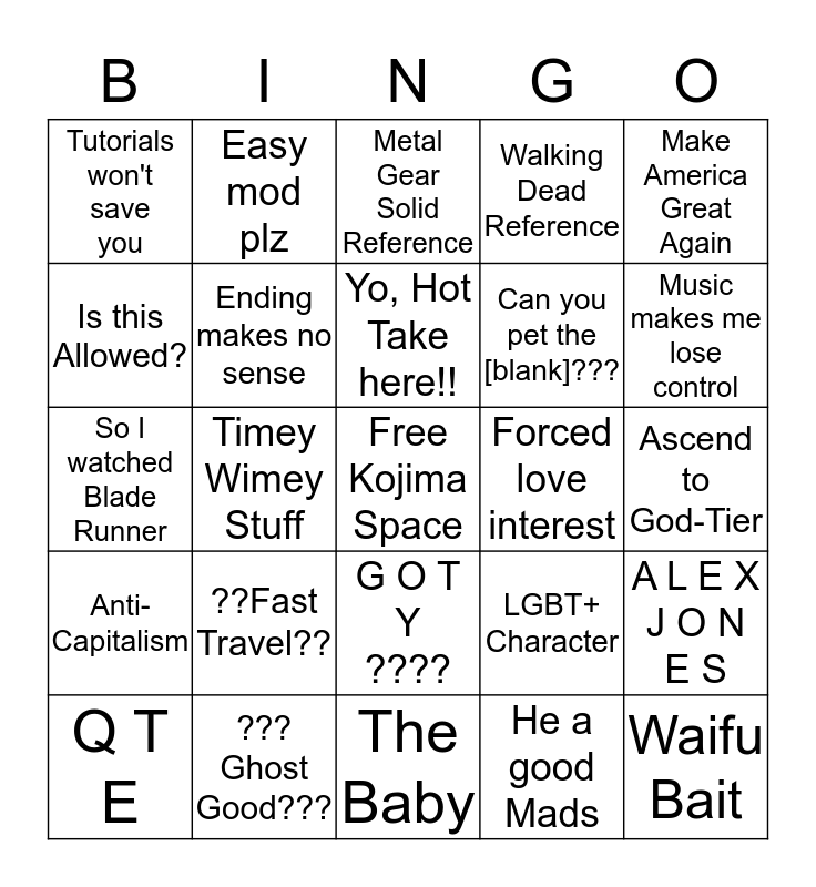 This bingo card has a free space and 24 words: Q T E, ??Fast Travel??, Yo, Hot Take here!!, He a good Mads, Make America Great Again, Tutorials won't save you, Easy mod plz, Metal Gear Solid Reference, Forced love interest, Ascend to God-Tier, So I watched Blade Runner, Ending makes no sense, LGBT+ Character, A L E X J O N E S, Is this Allowed?, ???Ghost Good???, The Baby, Walking Dead Reference, Music makes me lose control, Anti- Capitalism, Timey Wimey Stuff, G O T Y ????, Can you pet the [blank]??? and Waifu Bait.