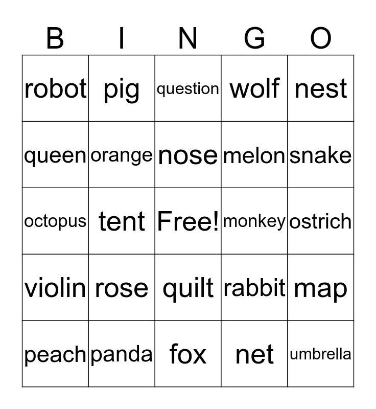 This bingo card has a free space and 24 words: rose, panda, nose, peach, nest, robot, queen, pig, monkey, quilt, melon, octopus, rabbit, map, orange, net, ostrich, question, snake, tent, umbrella, violin, wolf and fox.