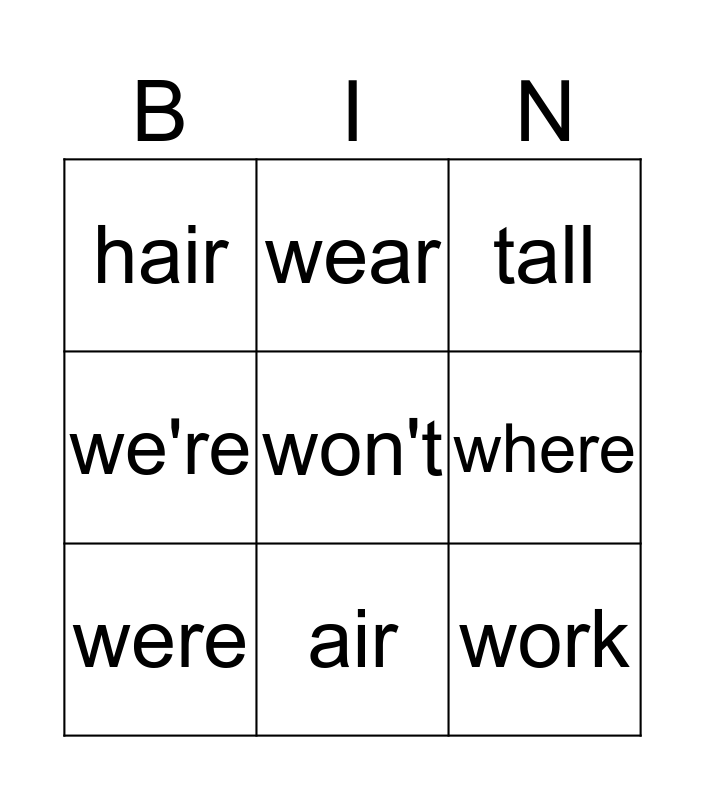 This bingo card has 13 words: Free!, wore, were, wear, we're, won't, work, walk, air, hair, where, tall and talk.