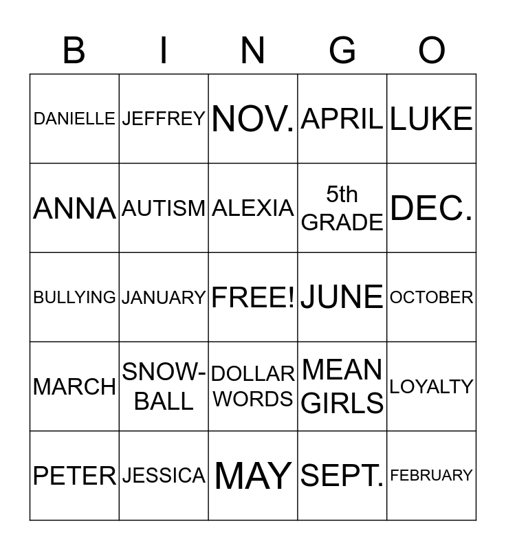 This bingo card has a free space and 24 words: SNOW- BALL, JESSICA, ALEXIA, PETER, LUKE, DANIELLE, ANNA, JEFFREY, JUNE, DOLLAR WORDS, 5th GRADE, BULLYING, MEAN GIRLS, LOYALTY, AUTISM, SEPT., OCTOBER, NOV., DEC., JANUARY, FEBRUARY, MARCH, APRIL and MAY.