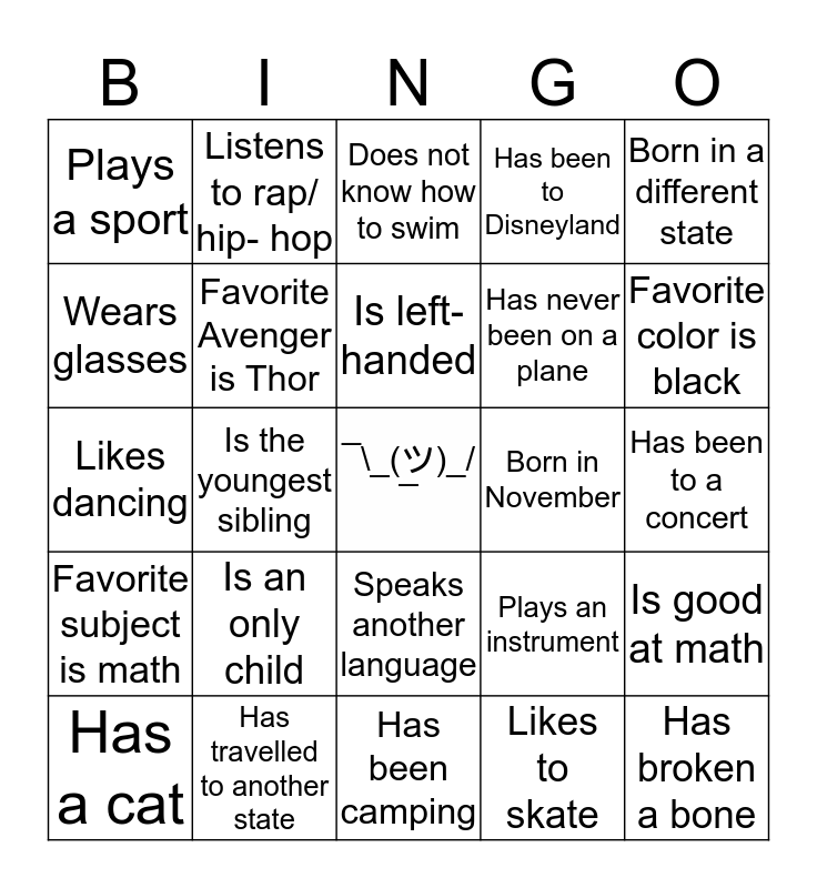 This bingo card has a free space and 24 words: Is an only child, Has travelled to another state, Is left-handed, Has a cat, Born in a different state, Plays a sport, Wears glasses, Listens to rap/ hip- hop, Born in November, Speaks another language, Has never been on a plane, Likes dancing, Plays an instrument, Is good at math, Favorite Avenger is Thor, Likes to skate, Has been to a concert, Does not know how to swim, Favorite color is black, Is the youngest sibling, Has broken a bone, Favorite subject is math, Has been to Disneyland and Has been camping.