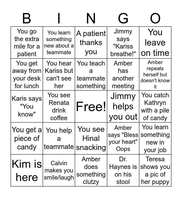 This bingo card has a free space and 29 words: Kim is here, You see Dr C. eat a Kit Kat, You see Renata drink coffee, You catch Nicole singing, You go the extra mile for a patient, A patient thanks you, You hear Kariss but can't see her, You help a teammate, Jimmy helps you out, Calvin makes you smile/laugh, You catch Kathryn with a pile of candy, Teresa shows you a pic of her puppy, Amber does something clutzy, Dr. Haynes is on his stool, Amber repeats herself but doesn't know it, Jimmy wants to order lunch, You see Hinal snacking, You get a piece of candy, You leave on time, Karis says "You know", Amber says "Bless your heart" Oops, You hear Teresa make a joke, Amber has another meeting, You get away from your desk for lunch, Jimmy says "Kariss breathe!", You learn something new about a teammate, You learn something new in your job, You teach a teammate something and You get to leave early!.