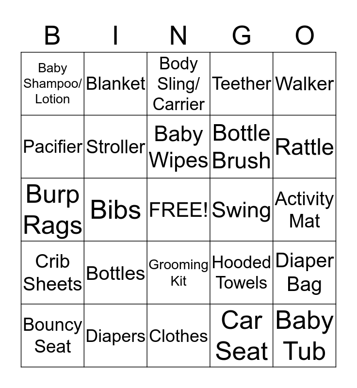 This bingo card has a free space and 24 words: Bottles, Diapers, Baby Wipes, Bouncy Seat, Walker, Baby Shampoo/ Lotion, Pacifier, Blanket, Swing, Grooming Kit, Bottle Brush, Burp Rags, Hooded Towels, Diaper Bag, Stroller, Car Seat, Activity Mat, Body Sling/ Carrier, Rattle, Bibs, Baby Tub, Crib Sheets, Teether and Clothes.