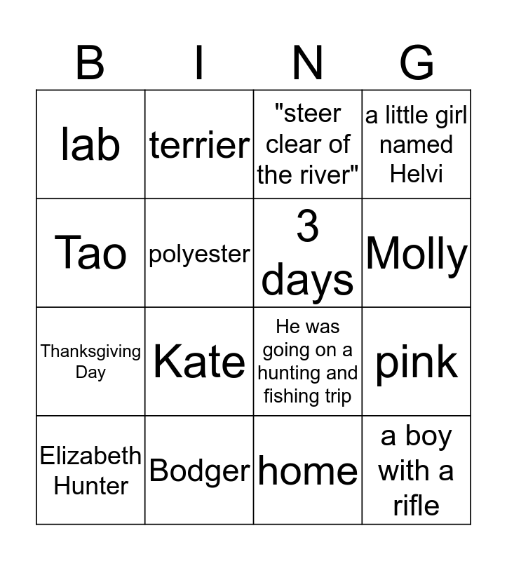 This bingo card has 24 words: Kentucky, John Longridge, He was going on a hunting and fishing trip, the housekeeper, lab, terrier, 3 days, a little girl named Helvi, Elizabeth Hunter, lynx, a boy with a rifle, Tao, Bodger, Michael J. Fox, pink, Sierras, Kate, "steer clear of the river", 100, Thanksgiving Day, polyester, home, Molly and deaf.