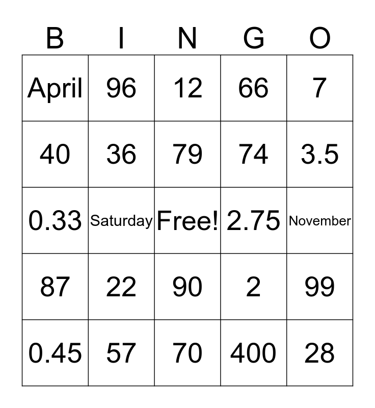 This bingo card has a free space and 24 words: 22, 57, 79, 0.45, 7, April, 40, 96, 2.75, 90, 74, 0.33, 2, 99, 36, 400, November, 12, 3.5, Saturday, 28, 87, 66 and 70.