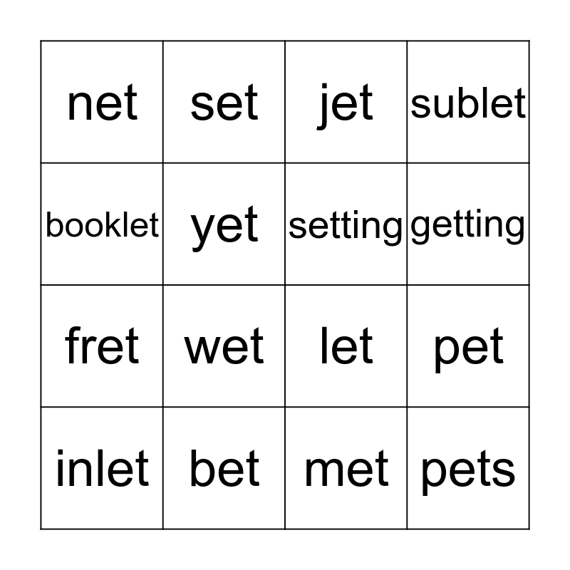 This bingo card has 16 words: bet, pet, jet, net, fret, set, let, met, booklet, yet, inlet, sublet, wet, getting, setting and pets.