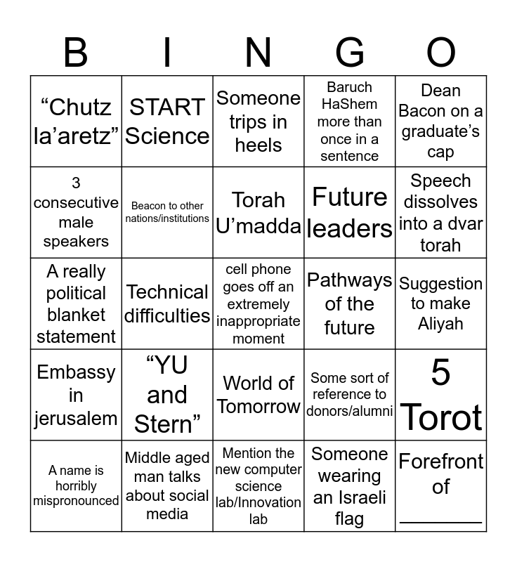 This bingo card has 25 words: “YU and Stern”, Mention the new computer science lab/Innovation lab, Torah U’madda, A name is horribly mispronounced, Dean Bacon on a graduate’s cap, “Chutz la’aretz”, 3 consecutive male speakers, START Science, Pathways of the future, World of Tomorrow, Future leaders, A really political blanket statement, Some sort of reference to donors/alumni, 5 Torot, Beacon to other nations/institutions, Forefront of _______, Suggestion to make Aliyah, Someone trips in heels, Speech dissolves into a dvar torah, Technical difficulties, cell phone goes off an extremely inappropriate moment, Middle aged man talks about social media, Embassy in jerusalem, Baruch HaShem more than once in a sentence and Someone wearing an Israeli flag.