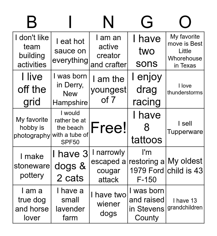 This bingo card has a free space and 24 words: I have 3 dogs & 2 cats, I have a small lavender farm, I am the youngest of 7, I am a true dog and horse lover, My favorite move is Best Little Whorehouse in Texas, I don't like team building activities, I live off the grid, I eat hot sauce on everything, I have 8 tattoos, I narrowly escaped a cougar attack, I enjoy drag racing, My favorite hobby is photography, I'm restoring a 1979 Ford F-150, My oldest child is 43, I was born in Derry, New Hampshire, I was born and raised in Stevens County, I sell Tupperware, I am an active creator and crafter, I love thunderstorms, I would rather be at the beach with a tube of SPF50, I have 13 grandchildren, I make stoneware pottery, I have two sons and I have two wiener dogs.