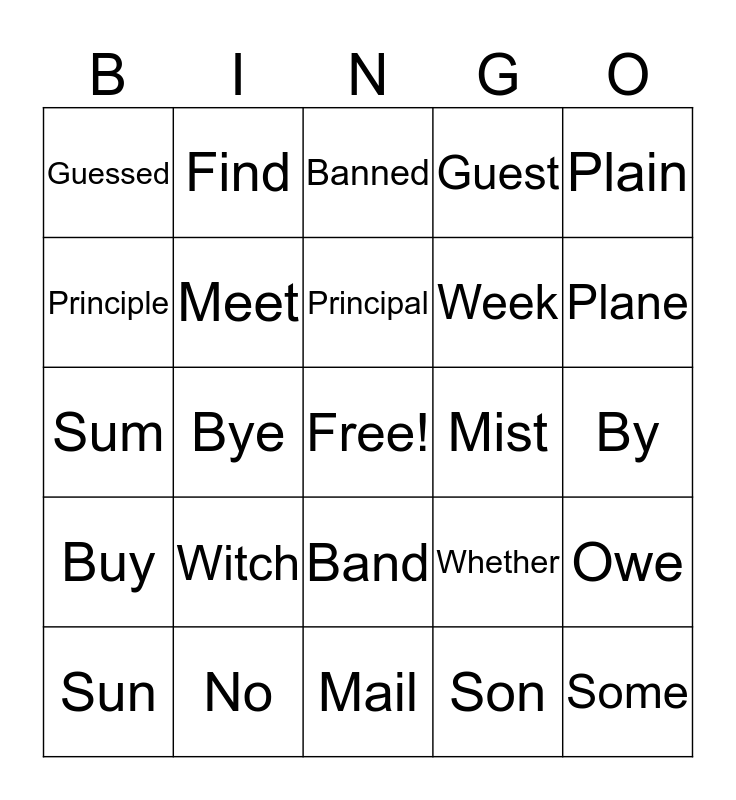 This bingo card has a free space and 43 words: Right, Some, Male, Sun, Missed, Son, Banned, Write, Plain, No, Guest, Mist, Band, Witch, Know, Mail, Mined, Sum, Mind, Plane, Find, Which, Find, Guessed, Weather, By, High, Hi, Whether, Buy, Flour, Owe, Oh, Bye, Flower, Thrown, Throne, Principal, Principle, Week, Weak, Meet and Meat.