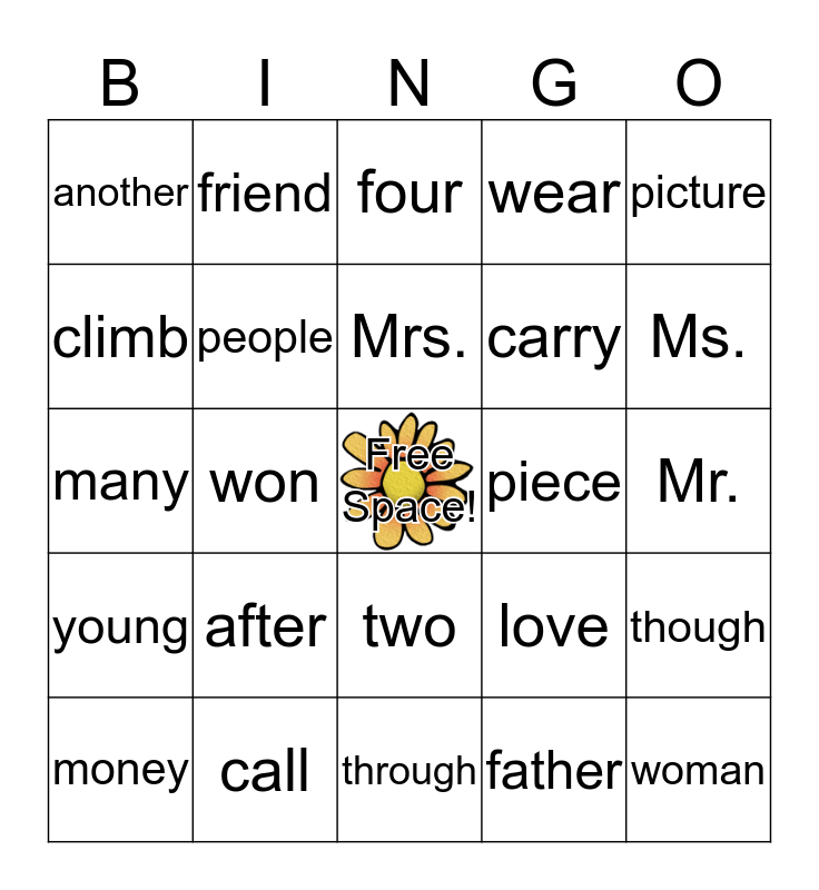 This bingo card has a free space and 24 words: after, call, Mrs., money, picture, another, climb, friend, piece, two, carry, many, love, though, people, father, Mr., four, Ms., won, woman, young, wear and through.
