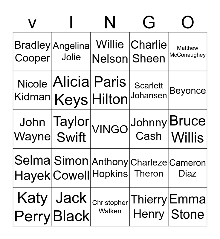 This bingo card has a free space and 39 words: Catherine Zeta-Jones, Justin Bieber, Mel Gibson, Alicia Keys, Katy Perry, Anthony Hopkins, Paris Hilton, Natalie Portman, Matthew McConaughey, Selma Hayek, Taylor Swift, Charlie Sheen, Emma Stone, Bruce Willis, Johnny Cash, Simon Cowell, Cheryl Cole, Bradley Cooper, Reece Witherspoon, Charleze Theron, Nicole Kidman, Christopher Walken, Scarlett Johansen, Beyonce, Roger Federer, Meg Ryan, Morgan Freeman, Liv Tyler, Kesha, Angelina Jolie, Lady Ga Ga, Christopher Eccleston, Willie Nelson, Jack Black, Thierry Henry, Emma Watson, Cameron Diaz, John Wayne and Hugh Jackman.