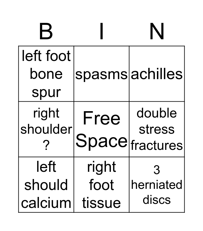 This bingo card has a free space and 8 words: double stress fractures, achilles, spasms, left should calcium, left foot bone spur, 3 herniated discs, right shoulder ? and right foot tissue.