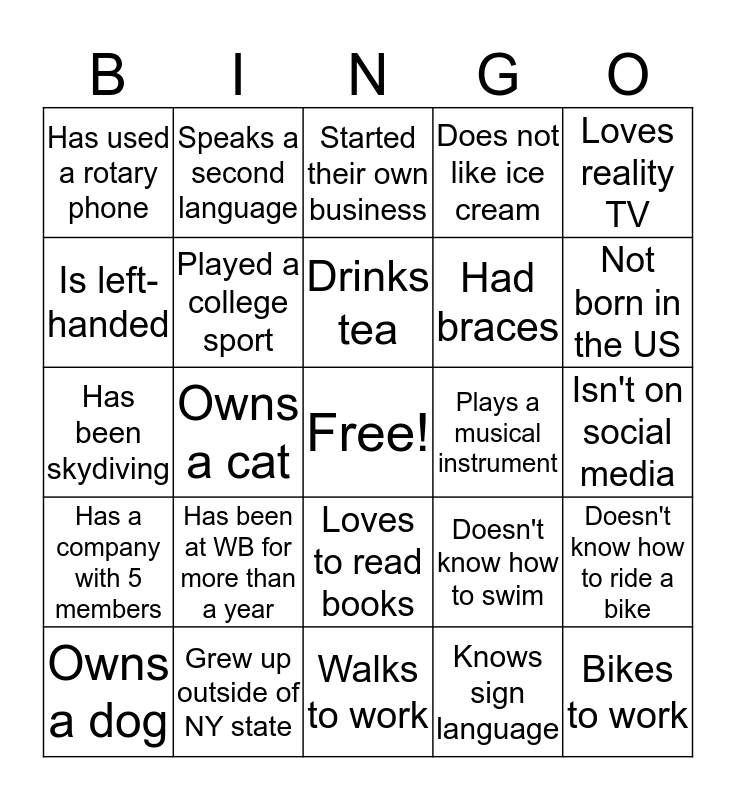 This bingo card has a free space and 24 words: Has been at WB for more than a year, Grew up outside of NY state, Drinks tea, Owns a dog, Loves reality TV, Has used a rotary phone, Is left-handed, Speaks a second language, Plays a musical instrument, Loves to read books, Had braces, Has been skydiving, Doesn't know how to swim, Doesn't know how to ride a bike, Played a college sport, Knows sign language, Isn't on social media, Started their own business, Not born in the US, Owns a cat, Bikes to work, Has a company with 5 members, Does not like ice cream and Walks to work.