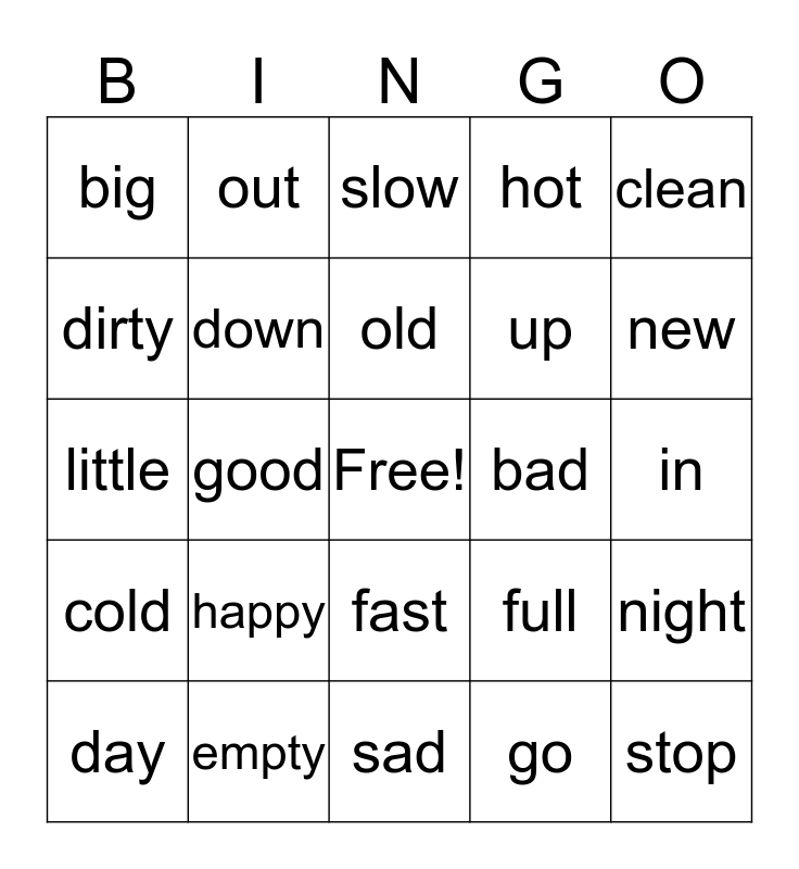 This bingo card has a free space and 24 words: happy, empty, old, day, clean, big, dirty, out, bad, fast, up, little, full, night, down, go, in, slow, new, good, stop, cold, hot and sad.