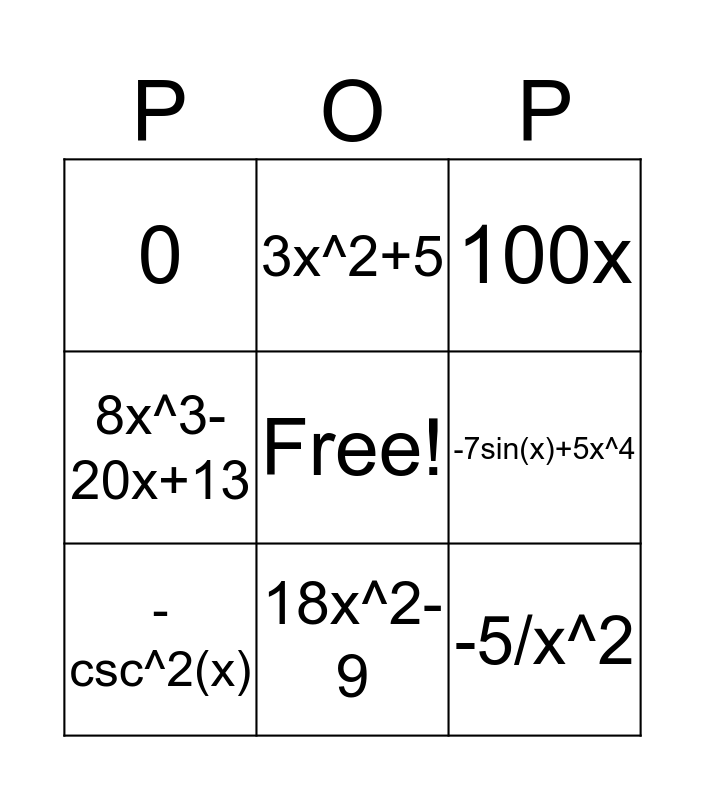 This bingo card has a free space and 8 words: -7sin(x)+5x^4, 100x, 3x^2+5, -csc^2(x), 0, -5/x^2, 8x^3-20x+13 and 18x^2-9.