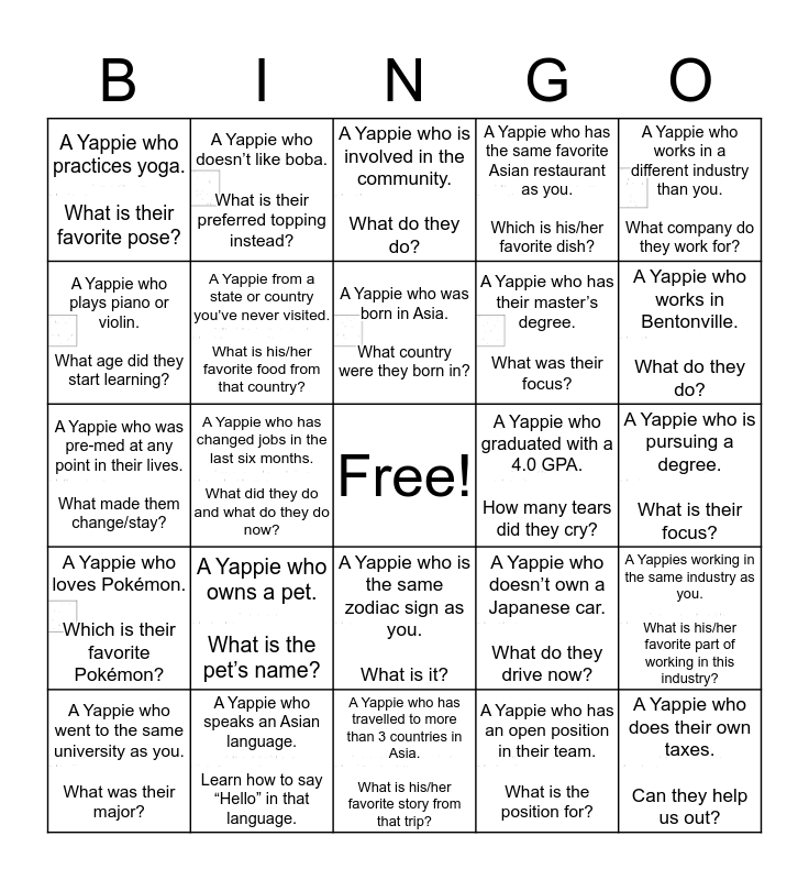 This bingo card has 24 images, a free space and 24 words: A Yappie who owns a pet. What is the pet’s name?, A Yappie who speaks an Asian language. Learn how to say “Hello” in that language., A Yappie who was born in Asia. What country were they born in?, A Yappie who went to the same university as you. What was their major?, A Yappie who works in a different industry than you. What company do they work for?, A Yappie who practices yoga. What is their favorite pose?, A Yappie who plays piano or violin. What age did they start learning?, A Yappie who doesn’t like boba. What is their preferred topping instead?, A Yappie who graduated with a 4.0 GPA. How many tears did they cry?, A Yappie who is the same zodiac sign as you. What is it?, A Yappie who has their master’s degree. What was their focus?, A Yappie who was pre-med at any point in their lives. What made them change/stay?, A Yappie who doesn’t own a Japanese car. What do they drive now?, A Yappies working in the same industry as you. What is his/her favorite part of working in this industry?, A Yappie from a state or country you’ve never visited. What is his/her favorite food from that country?, A Yappie who has an open position in their team. What is the position for?, A Yappie who is pursuing a degree. What is their focus?, A Yappie who is involved in the community. What do they do?, A Yappie who works in Bentonville. What do they do?, A Yappie who has changed jobs in the last six months. What did they do and what do they do now?, A Yappie who does their own taxes. Can they help us out?, A Yappie who loves Pokémon. Which is their favorite Pokémon?, A Yappie who has the same favorite Asian restaurant as you. Which is his/her favorite dish? and A Yappie who has travelled to more than 3 countries in Asia. What is his/her favorite story from that trip?.