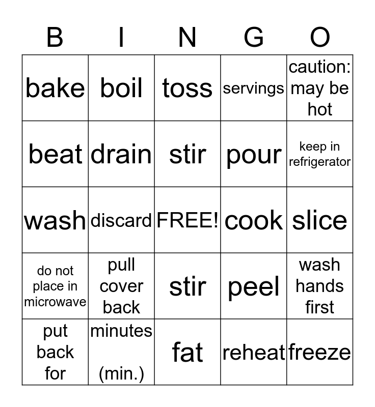 This bingo card has a free space and 24 words: pull cover back, minutes (min.), stir, put back for, caution: may be hot, bake, beat, boil, cook, stir, pour, wash, peel, wash hands first, drain, reheat, slice, toss, keep in refrigerator, discard, freeze, do not place in microwave, servings and fat.