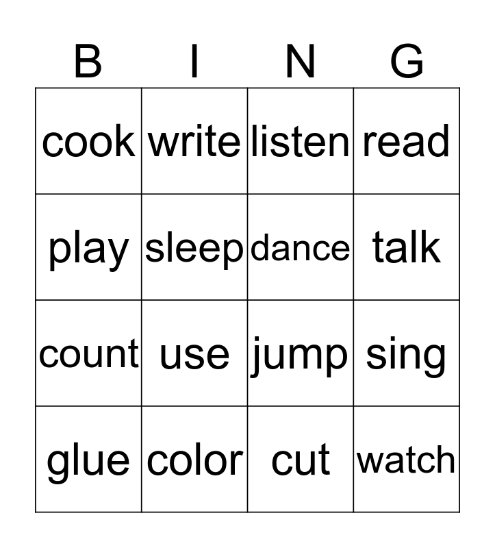 This bingo card has 16 words: color, sing, listen, cook, count, write, jump, cut, play, sleep, glue, read, use, talk, dance and watch.