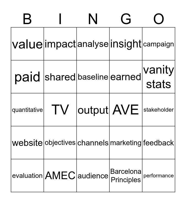 This bingo card has 45 words: outcome, output, out-take, evaluation, measurement, Barcelona Principles, analyse, research, campaign, AMEC, insight, AVE, channels, objectives, strategy, audience, budget, quantitative, qualitative, vanity stats, impact, framework, metrics, value, analytics, stakeholder, social media, traditional media, marketing, website, reporting, feedback, monitoring, success, data, TV, radio, SMART, performance, baseline, paid, earned, owned, shared and awareness.