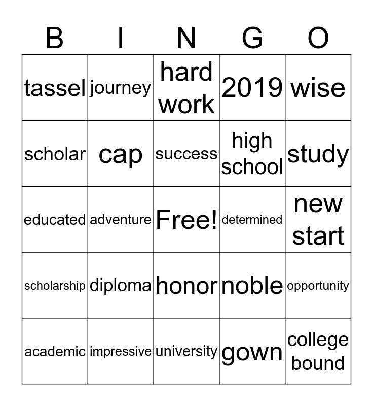 This bingo card has a free space and 24 words: diploma, impressive, success, academic, wise, tassel, scholar, journey, determined, honor, high school, educated, noble, opportunity, cap, gown, new start, hard work, study, adventure, college bound, scholarship, 2019 and university.