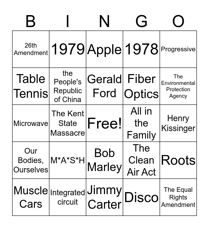 This bingo card has a free space and 29 words: Voyager, Integrated circuit, Apple, Atari, Progressive, 26th Amendment, the People's Republic of China, Gerald Ford, All in the Family, Roots, Muscle Cars, The Kent State Massacre, Disco, The Equal Rights Amendment, Microwave, The Nixon Shock, Jimmy Carter, The Clean Air Act, The Environmental Protection Agency, Our Bodies, Ourselves, M*A*S*H, 1974, Fiber Optics, Henry Kissinger, Table Tennis, 1979, Bob Marley, 1978 and Alan Brinkley.