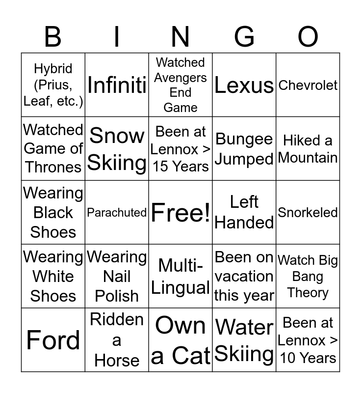 This bingo card has a free space and 29 words: Ford, Own a Dog, Parachuted, Tattoo'ed, Hybrid (Prius, Leaf, etc.), Watched Avengers End Game, Snow Skiing, Wearing Nail Polish, Left Handed, Ridden a Horse, Snorkeled, Been at Lennox > 10 Years, Own a Cat, Water Skiing, Hiked a Mountain, Pierced Ears, Multi-Lingual, Wearing White Shoes, Chevrolet, Wearing Black Shoes, Been on vacation this year, Been at Lennox < 1 Year, Bungee Jumped, Watched Game of Thrones, Lexus, Infiniti, Watch Big Bang Theory, Been at Lennox > 15 Years and BMW.