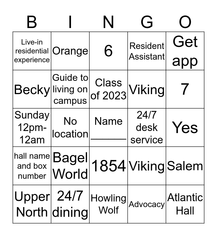 This bingo card has a free space and 29 words: Upper North, 4, No location, 70, Live-in residential experience, 6, Guide to living on campus, Bagel World, 24/7 desk service, 24/7 dining, Yes, Atlantic Hall, Howling Wolf, Advocacy, 7, O'keefe, 1854, hall name and box number, Get app, Sunday 12pm-12am, Viking, Witch craft, Viking, Becky, Resident Assistant, Orange, Salem, Class of 2023 and First Year.