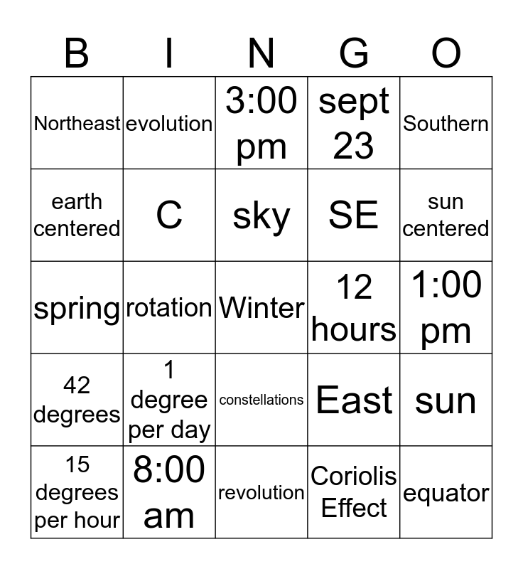 This bingo card has a free space and 29 words: 15 degrees per hour, Focault pendulum and Coriolis Effect, rotation, March 21, Northeast, 3:00 pm, C, 1 degree per day, 12 hours, 8:00 am, 1:00 pm, equator, revolution, Coriolis Effect, sun centered, Summer, constellations, 42 degrees, Southern, spring, East, Elmira, SE, earth centered, sept 23, evolution, sun, sky and universe.