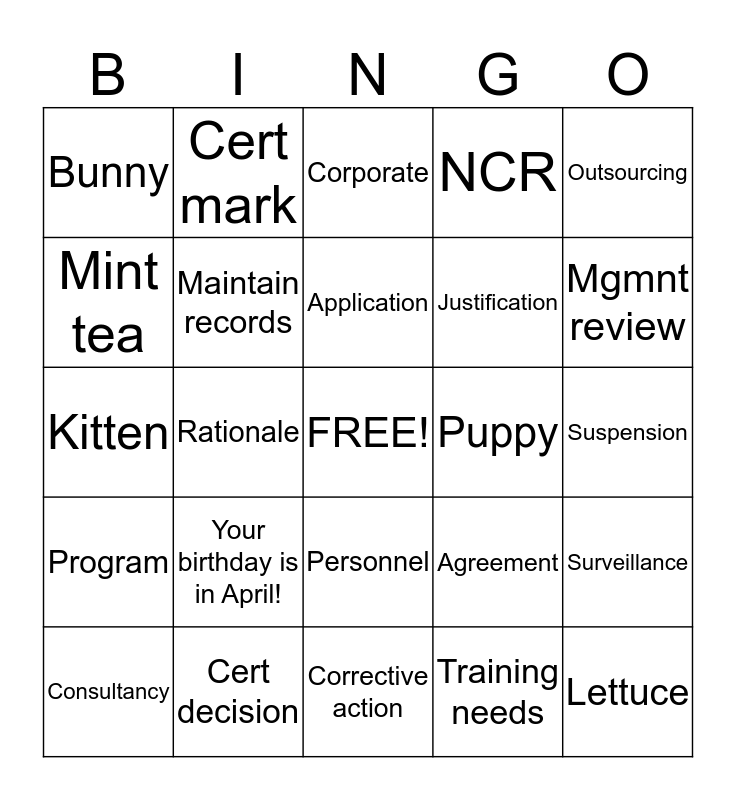 This bingo card has a free space and 24 words: Your birthday is in April!, Cert decision, Application, Consultancy, Outsourcing, Bunny, Mint tea, Cert mark, Puppy, Personnel, Justification, Kitten, Agreement, Surveillance, Maintain records, Training needs, Suspension, Corporate, Mgmnt review, Rationale, Lettuce, Program, NCR and Corrective action.