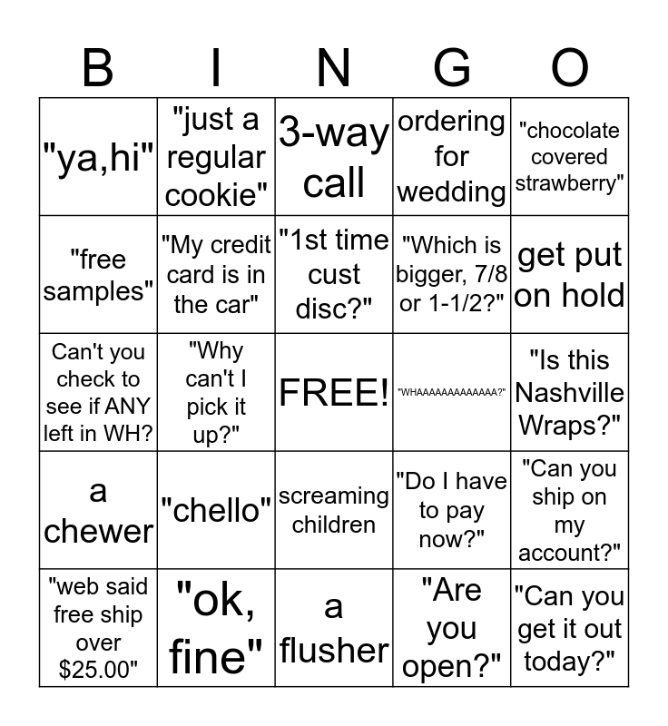 This bingo card has a free space and 24 words: "chello", "ok, fine", "1st time cust disc?", "web said free ship over $25.00", "chocolate covered strawberry", "ya,hi", "free samples", "just a regular cookie", "WHAAAAAAAAAAAAA?", screaming children, "Which is bigger, 7/8 or 1-1/2?", Can't you check to see if ANY left in WH?, "Do I have to pay now?", "Can you ship on my account?", "My credit card is in the car", "Are you open?", "Is this Nashville Wraps?", 3-way call, get put on hold, "Why can't I pick it up?", "Can you get it out today?", a chewer, ordering for wedding and a flusher.