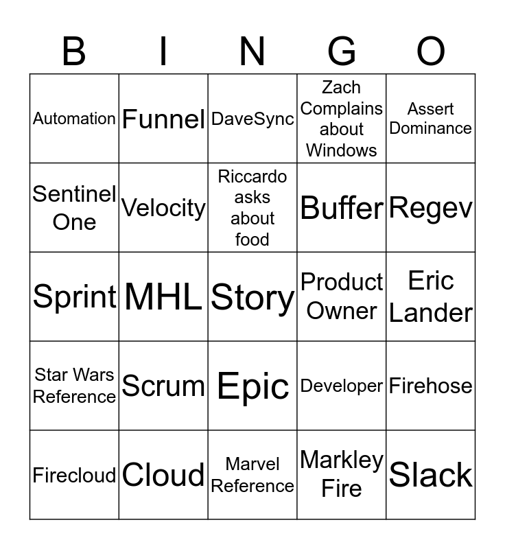 This bingo card has 30 words: Cloud, Agile, MHL, QoS, Automation, DaveSync, Velocity, Epic, Product Owner, Marvel Reference, Eric Lander, Story, Markley Fire, Slack, Regev, PCAPs, Developer, Star Wars Reference, Scrum, Assert Dominance, Sprint, 50 Interbelt, Funnel, Buffer, Sentinel One, Zach Complains about Windows, Firehose, Firecloud, Riccardo asks about food and Anthony "Asserts Dominance".