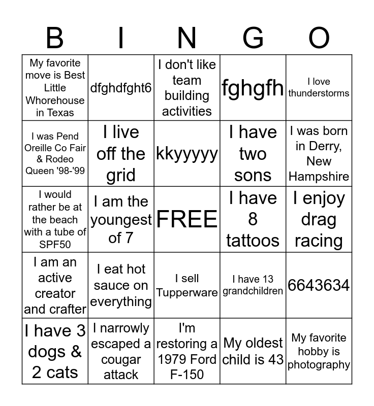 This bingo card has a free space and 29 words: I have 3 dogs & 2 cats, I have a small lavender farm, I am the youngest of 7, I am a true dog and horse lover, My favorite move is Best Little Whorehouse in Texas, I don't like team building activities, I live off the grid, I eat hot sauce on everything, I have 8 tattoos, I narrowly escaped a cougar attack, I enjoy drag racing, My favorite hobby is photography, I'm restoring a 1979 Ford F-150, My oldest child is 43, I was born in Derry, New Hampshire, I was born and raised in Stevens County, I sell Tupperware, I am an active creator and crafter, I love thunderstorms, I would rather be at the beach with a tube of SPF50, I have 13 grandchildren, I make stoneware pottery, I have two sons, I was Pend Oreille Co Fair & Rodeo Queen '98-'99, fghgfh, dfghdfght6, 6643634, kkyyyyy and aaaaaa.