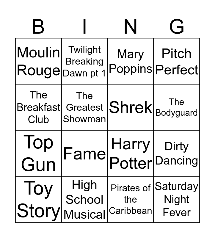 This bingo card has 16 words: High School Musical, Dirty Dancing, Mary Poppins, Moulin Rouge, Top Gun, Twilight Breaking Dawn pt 1, Harry Potter, Pirates of the Caribbean, The Breakfast Club, The Greatest Showman, Toy Story, Pitch Perfect, Fame, The Bodyguard, Shrek and Saturday Night Fever.