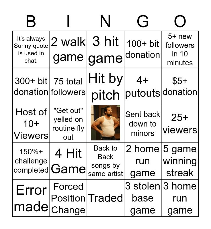 This bingo card has a free space and 24 words: 4 Hit Game, Forced Position Change, Hit by pitch, Error made, 5+ new followers in 10 minutes, It's always Sunny quote is used in chat., 300+ bit donation, 2 walk game, Sent back down to minors, Back to Back songs by same artist, 4+ putouts, Host of 10+ Viewers, 2 home run game, 5 game winning streak, 75 total followers, 3 stolen base game, 25+ viewers, 3 hit game, $5+ donation, "Get out" yelled on routine fly out, 3 home run game, 150%+ challenge completed, 100+ bit donation and Traded.