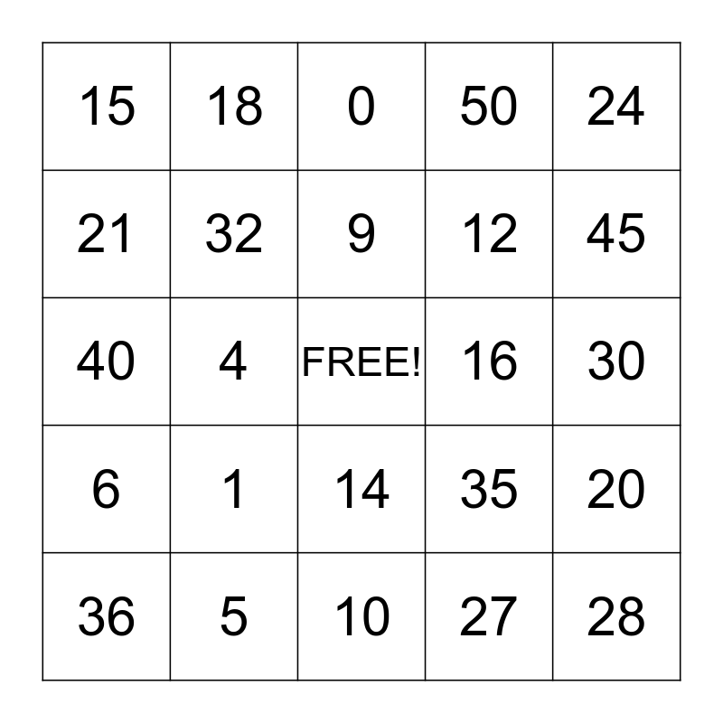 This bingo card has a free space and 24 words: 1, 5, 9, 36, 24, 15, 21, 18, 16, 14, 12, 40, 35, 20, 32, 27, 30, 0, 45, 4, 28, 6, 50 and 10.