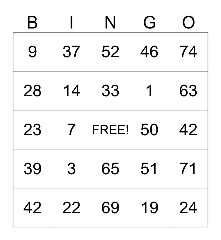 This bingo card has a free space and 24 words: 3, 22, 33, 42, 74, 9, 28, 37, 50, 65, 1, 23, 51, 71, 14, 19, 42, 52, 63, 7, 24, 39, 46 and 69.