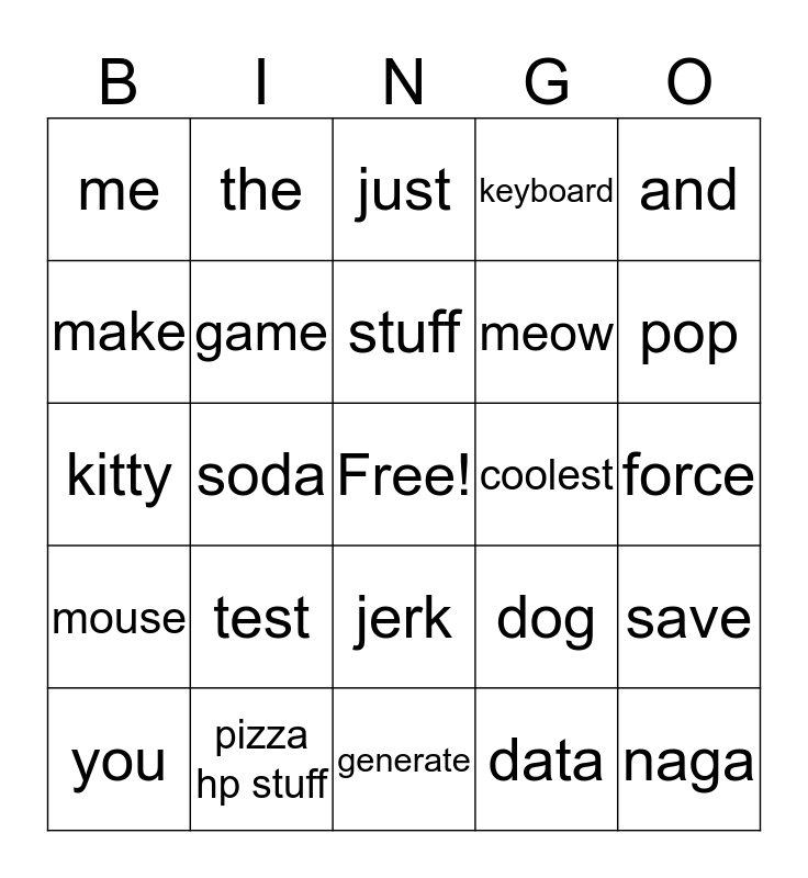 This bingo card has a free space and 24 words: test, pizza hp stuff, stuff, you, and, me, make, the, coolest, jerk, meow, kitty, dog, save, game, data, force, just, pop, soda, naga, mouse, keyboard and generate.