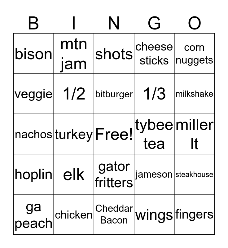 This bingo card has a free space and 24 words: elk, chicken, bitburger, ga peach, corn nuggets, bison, veggie, mtn jam, tybee tea, gator fritters, 1/3, nachos, jameson, steakhouse, 1/2, wings, miller lt, shots, milkshake, turkey, fingers, hoplin, cheese sticks and Cheddar Bacon.