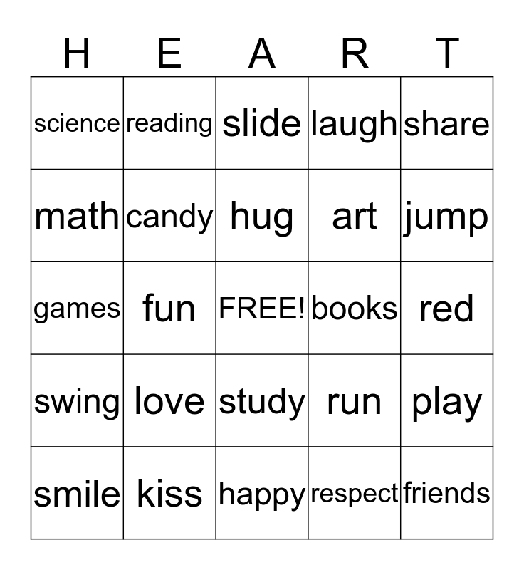 This bingo card has a free space and 24 words: love, kiss, hug, smile, share, science, math, reading, books, study, art, games, run, play, candy, respect, red, slide, jump, fun, friends, swing, laugh and happy.