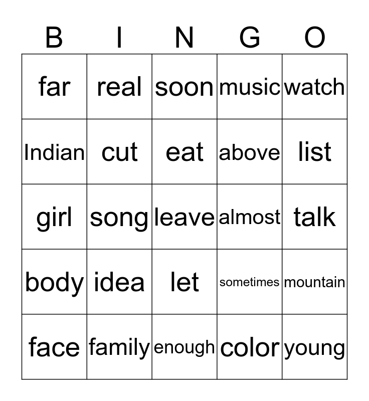 This bingo card has 25 words: idea, enough, eat, face, watch, far, Indian, real, almost, let, above, girl, sometimes, mountain, cut, young, talk, soon, list, song, leave, family, body, music and color.
