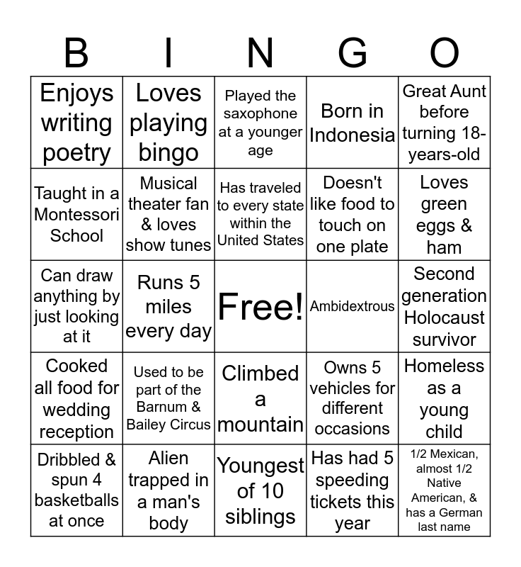 This bingo card has a free space and 24 words: Dribbled & spun 4 basketballs at once, Used to be part of the Barnum & Bailey Circus, Has traveled to every state within the United States, Has had 5 speeding tickets this year, Great Aunt before turning 18-years-old, Enjoys writing poetry, Loves playing bingo, Played the saxophone at a younger age, Ambidextrous, Second generation Holocaust survivor, Can draw anything by just looking at it, Musical theater fan & loves show tunes, Owns 5 vehicles for different occasions, Homeless as a young child, Taught in a Montessori School, Alien trapped in a man's body, Youngest of 10 siblings, Born in Indonesia, Loves green eggs & ham, Cooked all food for wedding reception, Runs 5 miles every day, Climbed a mountain, Doesn't like food to touch on one plate and 1/2 Mexican, almost 1/2 Native American, & has a German last name.