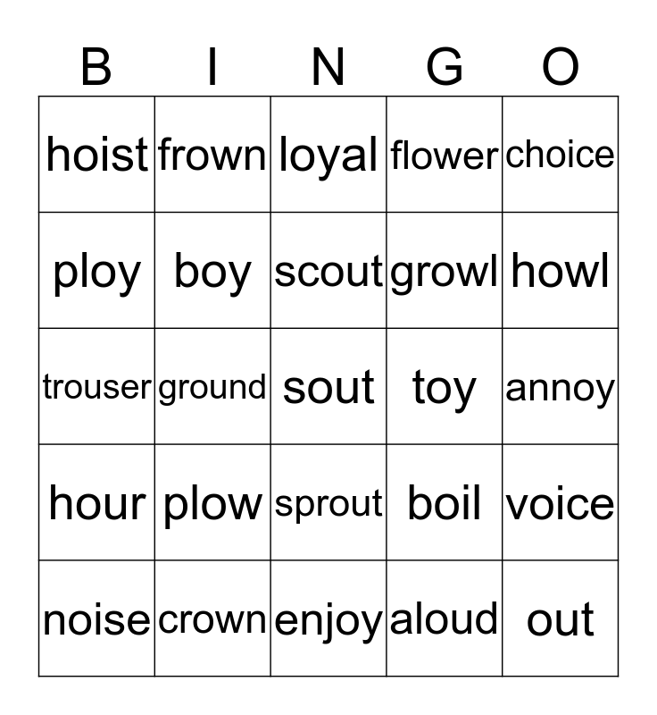 This bingo card has a free space and 24 words: plow, crown, scout, noise, choice, hoist, ploy, frown, toy, sprout, growl, trouser, boil, voice, boy, aloud, annoy, loyal, howl, ground, out, hour, flower and enjoy.