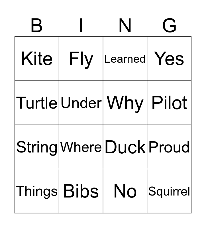 This bingo card has 20 words: Proud, Something, Learned, Many, Things, Turtle, Bibs, Kite, String, Fly, Where, Duck, Under, Squirrel, Why, Cat, Pilot, Yes, No and Bus.