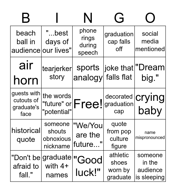 This bingo card has a free space and 37 words: childhood anecdote, microphone problem, graduate raises arms in triumph, tearjerker story, name mispronounced, someone shouts obnoxious nickname, sports analogy, someone trips, social media mentioned, someone hugs the announcer, the words "future" or "potential", graduation cap falls off, someone in the audience is sleeping, crying baby, air horn, historical quote, person giving speech cries or gets choked up, phone rings during speech, "We/You are the future...", decorated graduation cap, beach ball in audience, "Dream big.", "Don't be afraid to fall.", "Good luck!", teacher mentioned in speech, athletic shoes worn by graduate, "...best days of our lives", joke about being nervous, graduate with Jr./III/etc. in name, graduate wearing 3"+ heels, "Follow your dream/passion", graduate with 4+ names, guests with cutouts of graduate's face, "This is the last time we'll be together.", quote from pop culture figure, joke that falls flat and someone doesn't understand how microphones work.