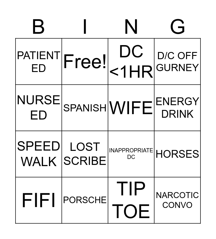 This bingo card has 19 words: INAPPROPRIATE DC, DELAY OF CC PROCEDURES, DC <1HR, NARCOTIC CONVO, HORSES, NURSE ED, TIP TOE, PATIENT ED, Free!, SPEED WALK, LOST SCRIBE, SPANISH, WIFE, PORSCHE, FIFI, BOUNCE BACK, D/C OFF GURNEY, ENERGY DRINK and PARFAIT.
