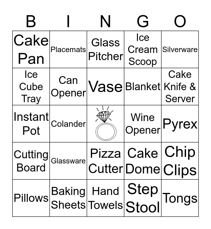 This bingo card has a free space and 24 words: Glassware, Baking Sheets, Vase, Pillows, Silverware, Cake Pan, Ice Cube Tray, Placemats, Wine Opener, Pizza Cutter, Blanket, Instant Pot, Cake Dome, Chip Clips, Can Opener, Step Stool, Pyrex, Glass Pitcher, Cake Knife & Server, Colander, Tongs, Cutting Board, Ice Cream Scoop and Hand Towels.
