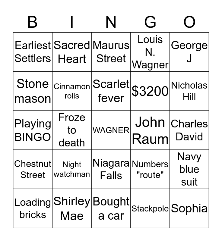 This bingo card has a free space and 49 words: John Waggoner, Sophia, Marcella, Bought a car, Night watchman, NELCO, Sacred Heart, Francis Gerg, Stone mason, 10 in 21 years, Cinnamon rolls, Louis N. Wagner, Navy blue suit, Numbers "route", Train whistle, Double hernia, Scarlet fever, John Raum, Barbara Gerg, George J, Froze to death, Stackpole, Earliest Settlers, $3200, Martina Elizabeth, Nicholas Hill, Loading bricks, Wagon maker, Niagara Falls, Chestnut Street, Mary Jane, William George, Margaret Lucille, Martha Lorraine, Shirley Mae, Barbara Catherine, Nancy Lee, George Richard, Charles David, German, Frenchman, Michael Gerg, WW1, Elk Brick Co., Playing BINGO, Maurus Street, North Michael Street, Train and Lumberjack.