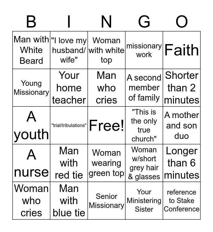 This bingo card has a free space and 24 words: Man with red tie, Man with blue tie, Man who cries, Woman who cries, Faith, Man with White Beard, Young Missionary, "I love my husband/ wife", "This is the only true church", Woman wearing green top, A second member of family, A youth, Woman w/short grey hair & glasses, Longer than 6 minutes, Your home teacher, Your Ministering Sister, A mother and son duo, Woman with white top, Shorter than 2 minutes, "trial/tribulations", reference to Stake Conference, A nurse, missionary work and Senior Missionary.